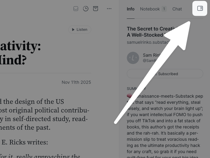 To collapse the right side panel (containing Info, Notebook, and Chat), click the Hide right panel button in the top right corner or use the keyboard shortcut ].