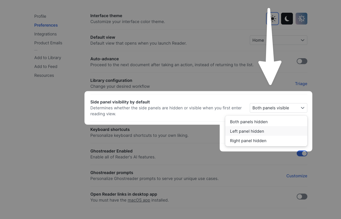 Reader has both light mode and dark mode, as well as an "auto" setting to detect the theme of the operating system. You can change the mode at any time from the Appearance menu, or you can use the keyboard shortcut Cmd/Ctrl + Option + T.
