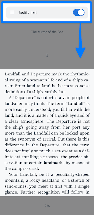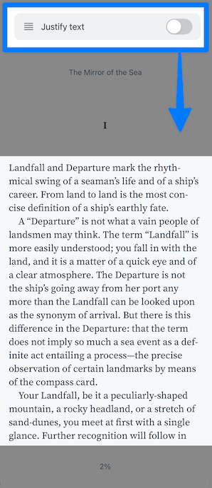 If a ragged right edge doesn't feel enough like a real book, you can turn on the Justify text toggle in More style settings.