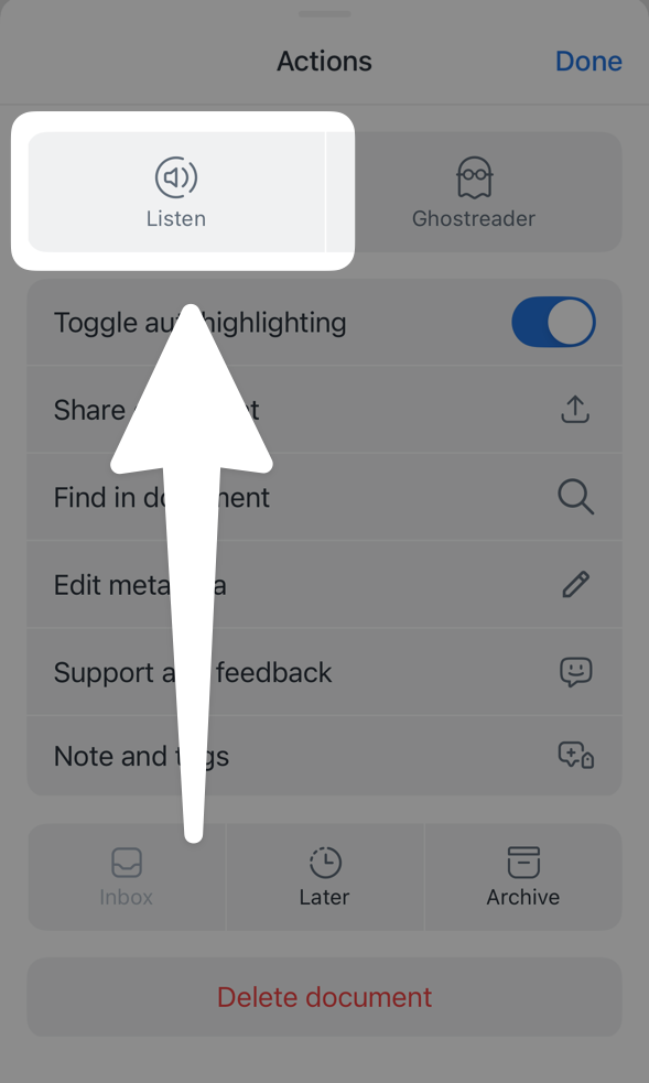 To use TTS, open the action menu (...) in the lower right and tap the Listen icon at the top of the panel.